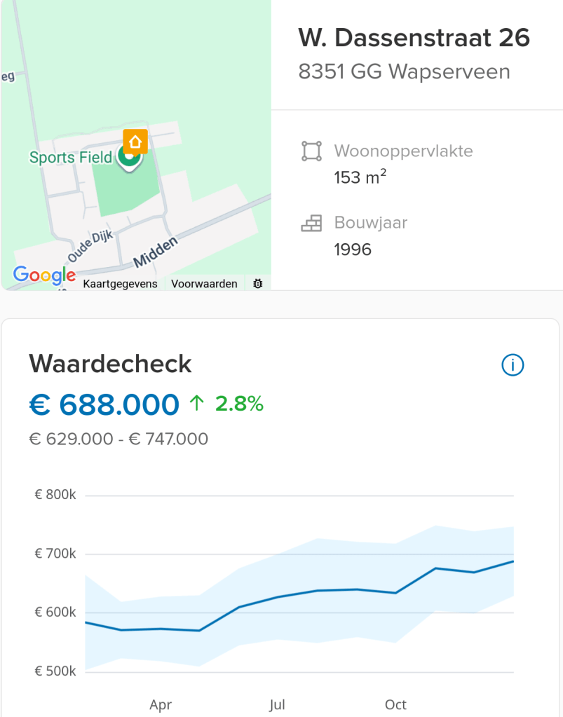 De waarde van ons huis in januari 2026 was volgens Funda € 688.000,=